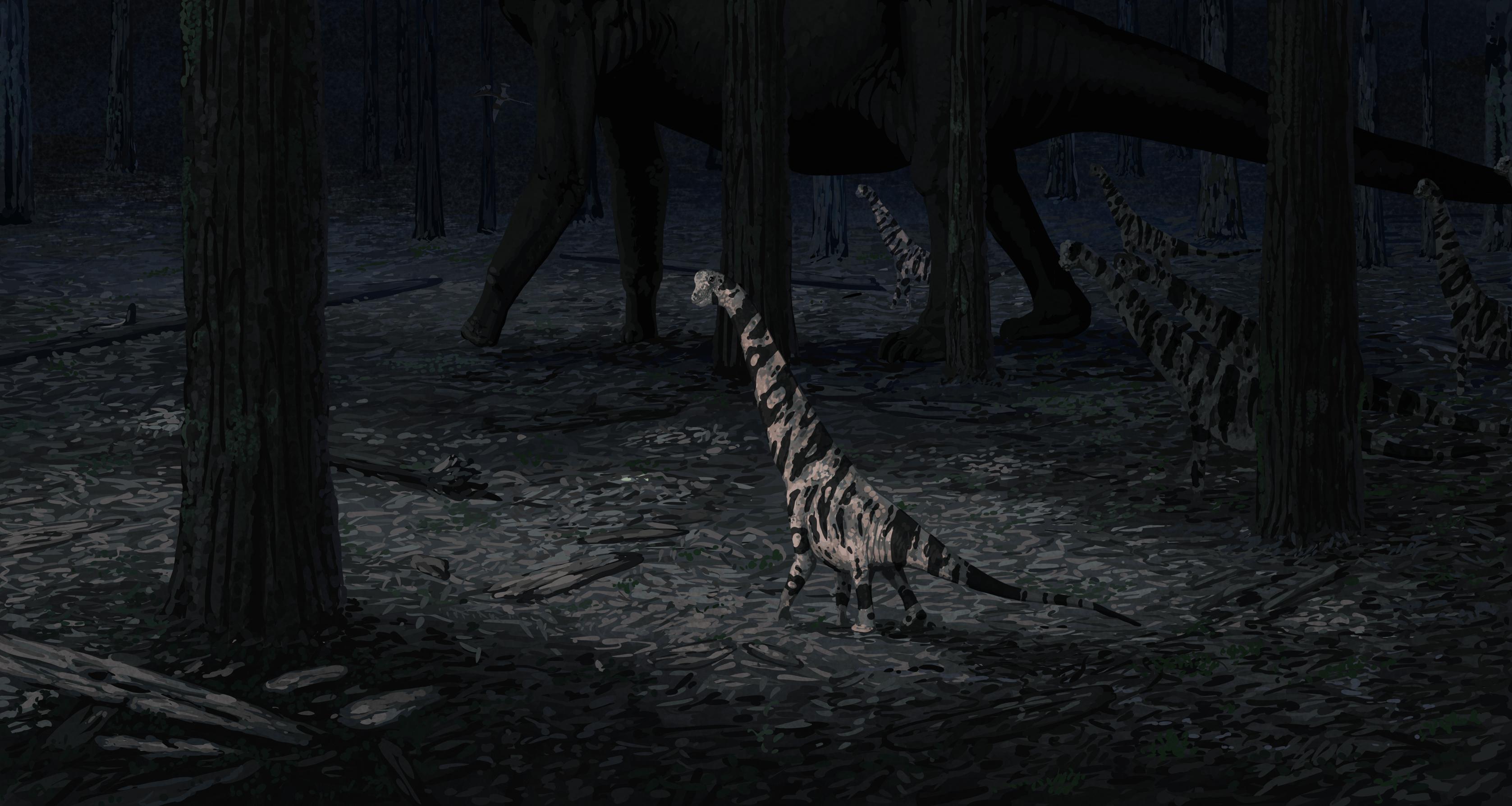 Some baby Brachiosaurus scuttle through the forest. Very young sauropods are not found in the trackways of sauropod groups, so there is some question as to how baby sauropods lived.