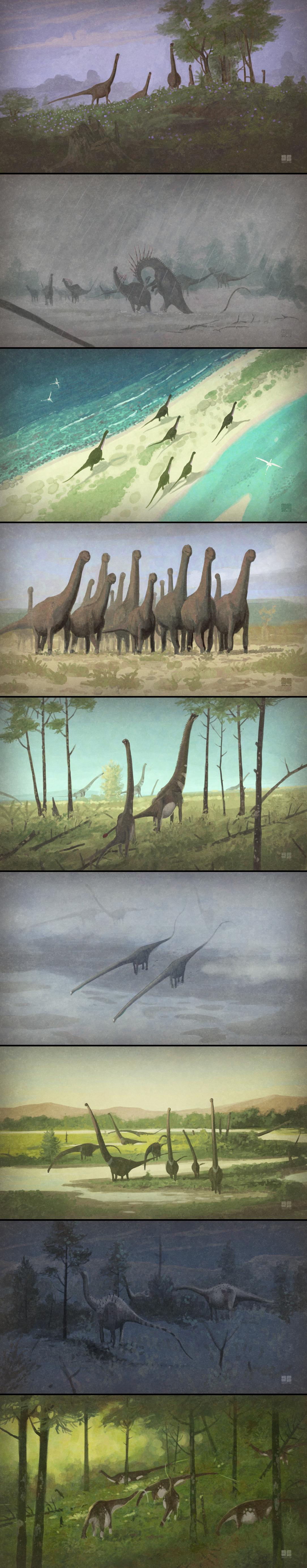 This is a series of speed-paintings of sauropod herds. From top to bottom: