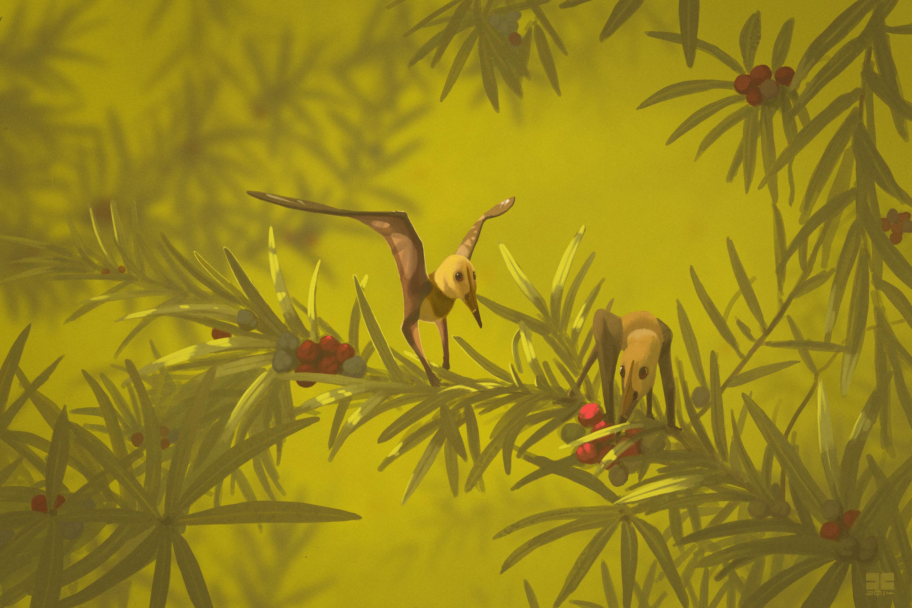 This is an uncertain pterosaur, possibly Nemicolopterus, but probably a juvenile Sinopterus. One thing that is certain, though, is that in this painting, it is enjoying some red podocarp berries. Not the purple berries: they taste like burning.