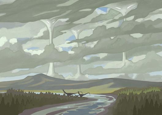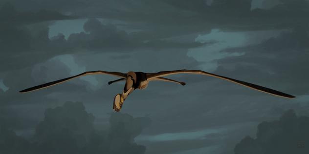 A striking and evocative image showing a figure in a state of freefall against a backdrop of billowing white clouds and a dark blue sky. The figure is silhouetted and appears almost featureless, with a flowing mane of bright, fiery orange hair that stands in stark contrast to its shadowy form. The figure's limbs are splayed out in a dramatic display, with the hands and fingers elongated, accentuating the feeling of motion and descent. The overall composition evokes a sense of dynamic movement and the interplay between light and dark, with the clouds below reflecting the sky's gradient from a soft teal to a deep navy.